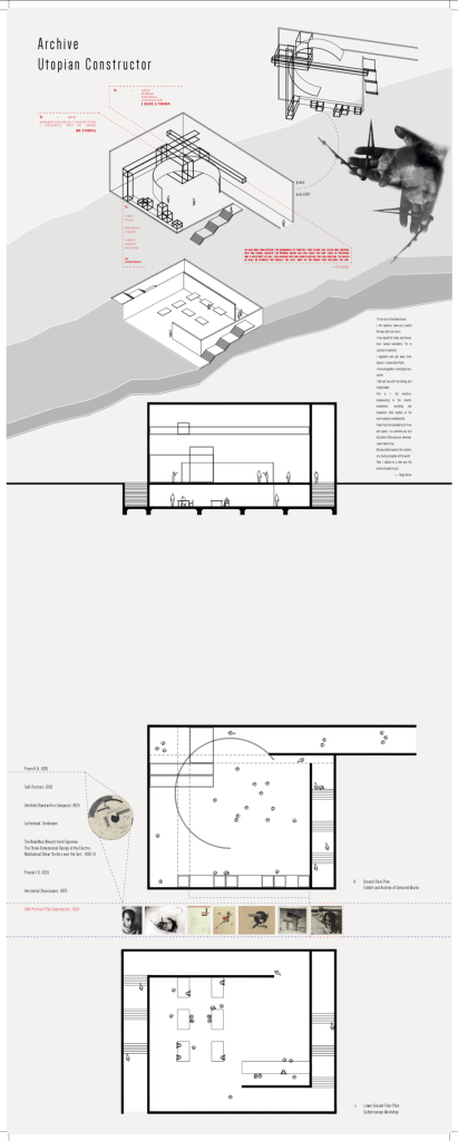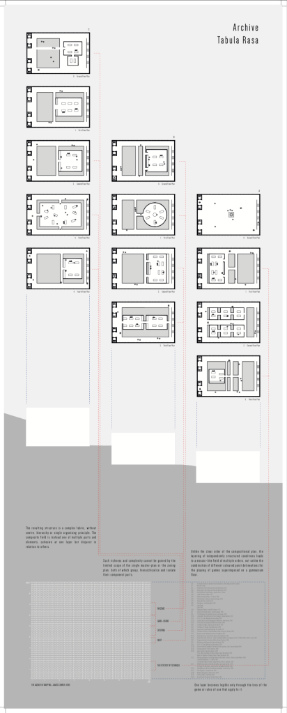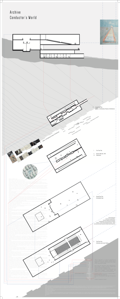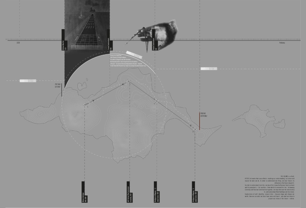 The island is a field of endangered ideas. A field of events, enabling our understanding of a unique array of conceptual artefacts through an archive. The archive distributed across the island, houses a textual, visual, and spatial concept: The Agency of Mapping, James Corner; The Constructor, El Lissitzky; Maison a Bordeaux, Rem Koolhaas.